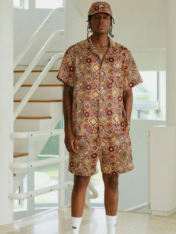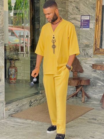 2pcs button down shirt with a short sleeve and also a drawstring pant with a little side slit on the bottom seam